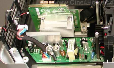 Besonders auffällig sind die beiden großen Lüfter an der Gerätevorderseite, die für eine starke aber leise Gerätekühlung sorgen sollen. Zur weiteren Untersuchung haben wir die Elektronik aus ihrer „Metallfassung“ genommen und waren von den Hersteller-Logos sehr überrascht.