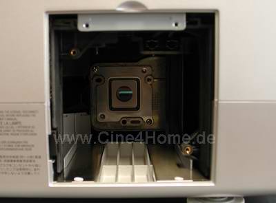 Der früher oder später notwendige Austausch des Lampenmoduls gestaltet sich als äußerst einfach. Auf der rechten Seite wird der Lampenschacht mit Hilfe eines Schraubenziehers geöffnet, ohne dass der Projektor aus einer Deckenhalterung gelöst werden muss.