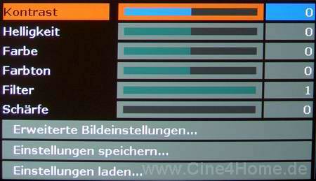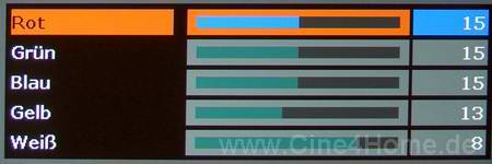 Neben diesen „Basics“ gibt es in der Rubrik „Erweiterte Bildeinstellungen“ noch zusätzliche und weiterführende Parameter zur Bildbeeinflussung. Zu der Auswahl verschiedener Farbtemperatur Presets kann man hier die einzelnen Primär- und Sekundärfarben in ihrer Farbsättigung abstimmen und die gewünschte Weißbetonung festlegen. Nachdem der Nutzer die für seine Quelle optimalen Einstellwerte gefunden hat, kann er diese unter „Einstellungen speichern“ in einer Bank ablegen und bei Bedarf jederzeit wieder aufrufen.