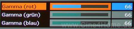 Erweitert-Menü Im Erweitert-Menü findet der fortgeschrittene Heimkinonutzer Bildparameter, die er im Bild-Menü vermisst hat. Besonders für den erforderlichen Weißabgleich des Projektors auf 6500K (D65) stehen hier jede Menge Parameter zur Verfügung. Neben den obligatorischen Gain- und Bias- Reglern ist besonders die für R,G und B getrennt durchführbare Gammakorrektur lobend hervorzuheben. Unglücklich sind aber viele der Übersetzungen (Kurve, Zuwachs, Offset), die technisch unverständlich erscheinen und eher auf eine Babelfish-Übersetzung denn auf ein professionelles Übersetzungsbüro rückschließen lassen. Auch die Trennung von Gain und Bias in unterschiedliche Kategorien machen die Kalibrierungsprozedur unnötig umständlich. Wie im Bildmenü kann der Anwender nach erfolgreicher Arbeit seine Ergebnisse in zwei verschiedenen Speicherbänken ablegen und bei Bedarf abrufen. Neben den wichtigen Bildparametern seien noch die zusätzlichen Faroudja-Optionen für eingehende Halbbildsignale zu erwähnen.