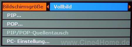Im Display Menü finden sich letztendlich die restlichen Bildparameter, wie Bildformat, PC-Signalanpassung und PIP-Funktionen.