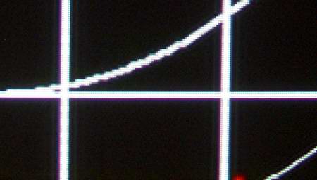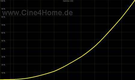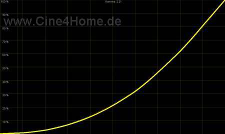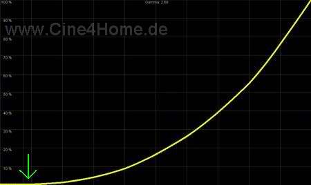 Wer sich das Diagramm oben genau ansieht, wird bemerken, dass vor allem die dunklen Bereiche (links) deutlich zu flach ausfallen, zwischen Schwarz und 10% Helligkeit ist praktisch kein Unterschied auszumachen (grüner Pfeil). Grund hierfür ist ein falscher Schwarzpegel des Projektors. Und tatsächlich, in dunklen Filmsequenzen, werden nahezu alle Details im Bild unterschlagen, umgangssprachlich „versumpft“ das Bild. Wie bei der Farbdarstellung kommt man um eine manuelle Korrektur nicht herum: Ausgangspunkt und unbedingt notwendig ist hier eine digitale Zuspielung nach „DVI-Video“ Standard. Bei DVI-Video wird der Schwarzpegel angehoben. Doch dies alleine reichte bei unseren Tests nicht, zusätzlich muss der Helligkeits-Regler bis ins obere Drittel angehoben werden. Dies ist sehr ungewöhnlich und lässt auf einen Programmier-Bug in der Firmware schließen. Hat man den Schwarzpegel mit Hilfe der passenden Testbilder optimiert, so zeigt sich ohne weitere Korrekturen ein angemessener Helligkeits-Anstieg von 2,21.