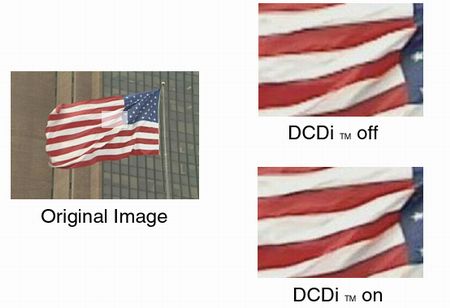 Videomaterial: Nach dem "Motion-Adaptive"-Verfahren wird der Bildinhalt stets auf statische und bewegte Inhalte überprüft. Die unbewegten Bildinhalte werden aus zwei aufeinander folgenden Halbbildern zusammen geflochten. Bei bewegten Bildinhalten hingegen muss der Algorithmus die fehlenden Bildzeilen selbst interpolieren. Die DCDi Technik wertet hier die Details durch geometrische Erkennung von diagonalen Bildelementen auf. Das Ergebnis ist eine hervorragende Detaildarstellung ohne störendes Kantenflimmern oder Unschärfen. Eindrucksvoll lässt sich dies mit der beliebten DCDi-Demosequenz, einer im Wind wehenden Flagge, aufzeigen.