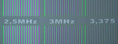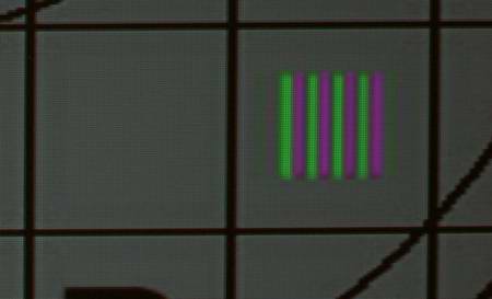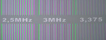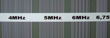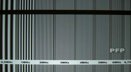 Analog Wie man im Bild unten leicht beobachten kann, provoziert der Scaler schon in relativ geringen Auflösungsbereichen von 4MHz bis 5MHz sichtbare Linearitätsschwankungen im Videobild. Durch diese ungenaue Umrechnung entstehen in kleinen Details deutliche Detailverluste und Interferenzen in feinen Strukturen. Besonders in bewegten Mustern sind die Skalierungsschwankungen klar zu beobachten. Sehr positiv in der Skalierung fällt auf der anderen Seite auf, dass auch in hohen Auflösungsbereichen von 6MHz bis 6,75MHz kein großer Pegelabfall zu beobachten ist, wobei kleine Details in ihrer Helligkeit und Dynamik kaum beeinträchtigt werden. Bei der Farbauflösung sind ebenfalls gute Ergebnisse zu verzeichnen, lediglich im höchsten DVD-Auflösungsbereich verliert das Bild an Farbdynamik. Im Filmbild erscheinen kleine Details demnach nicht so bunt, wie es der Aufzeichnungsstandard erlaubt.