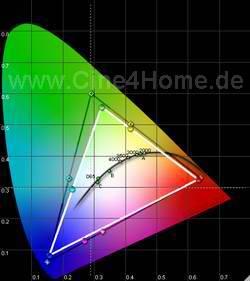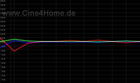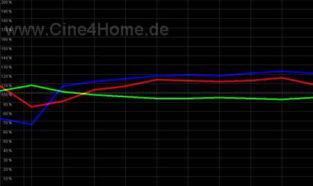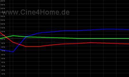 Wie im Diagramm oben zu erkennen ist, lässt sich durch Geduld und Erfahrung ein in allen Helligkeiten perfekter Abgleich auf die D65 Norm erreichen. Keine Farbe wird über- bzw. unterbetont. Besonders vorbildlich ist auch das lineare Verhalten unter 30% Helligkeit, nur wenig Digital-Projektoren lassen sich in dunklen Bereichen so gut in den Griff bekommen. In Verbindung mit dem guten Farbraum des Projektors ist so eine adäquate Farbreproduktion des Kino-Originals möglich, die keine Wünsche mehr offen lässt.