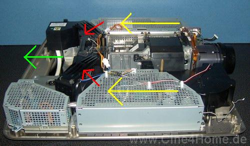 Der Luftweg lässt sich am geöffneten Gerät am besten skizzieren: Die an der Vorderseite angesaugte Luft wird rechts und links neben dem optischen Block durch diverse Netzteile und elektronische Bauteile geleitet (in den Metallkäfigen abgeschirmt).