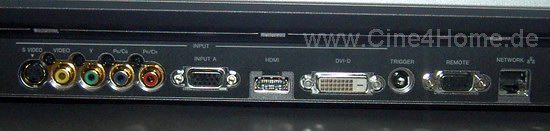 Die Anschlüsse sind unauffällig halb unter dem Projektor platziert und übersichtlich nebeneinander angeordnet. Neben den digitalen Eingängen befinden sich auch die Analog-"Klassiker" wie Composite (Cinch), S-Video (Hosiden), YUV (3xCinch) und RGB HV (SubD). Zudem gibt es einen Triggerausgang für die Leinwand, einen seriellen Remote-Eingang und sogar eine Netzwerk-Verbindung. Über diese zusätzlichen Eingänge kann der Projektor auch mit dem Computer verbunden werden, um per Gamma-Software Bildeinstellungen vorzunehmen, mehr dazu in unserem Bildteil.