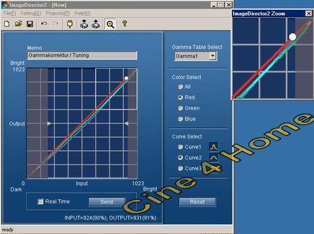Der Image Director ist eine PC-Software auf CD, die auf jedem Computer problemlos installiert werden kann. Dieser muss mit dem Projektor seriell oder per Netzwerkkabel verbunden werden, die jeweilige Verbindungsart kann im Programm gewählt werden. Mit Hilfe des ImageDirectors kann die Gammaverteilung bequem mit Hilfe der Maus in unterschiedlichen Bereichen manipuliert werden. Auch eine separate Einstellung der einzelnen Farbkanäle R,G und B ist möglich. Somit kann die Software auch zum Feintuning der Farbdarstellung verwendet werden. Auch heute noch sind zusätzliche PC-Einstellprogramme eher die Seltenheit, weshalb Sony hier weiter punkten kann.
