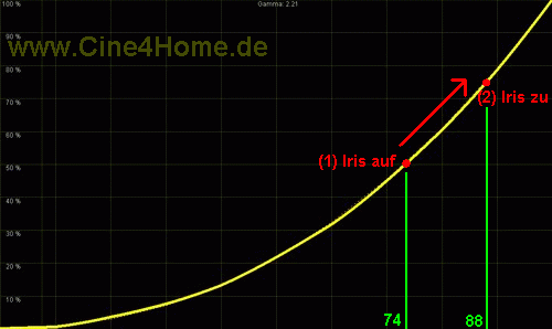 Der Gammaspielraum ist in den hohen Bereichen demnach komprimiert und bietet nicht mehr so viel Raum für Abstufungen. Bei sich schließender Blende rücken helle Elemente aneinander und sind nicht mehr so deutlich voneinander differenzierbar. Weiße Elemente können zudem nicht mehr in ihrer Helligkeit ausgeglichen werden, da sie bereits am oberen "Ende" der Helligkeit angelangt sind, sie werden unweigerlich dunkler mit sich schließender Iris.