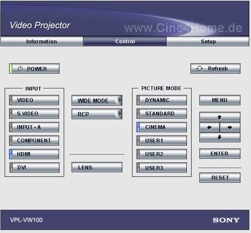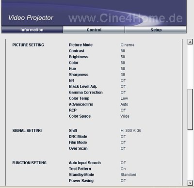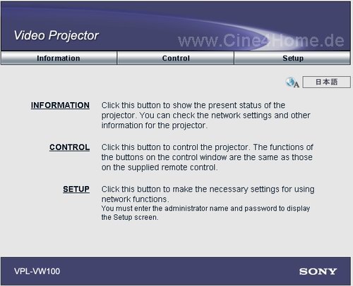Verbindet man einen PC mir dem Projektor über ein Netzwerkkabel, so reicht ein herkömmlicher Internetbrowser (einfach IP-Adresse eingeben), um die gesamte Steuerung bequem per Maus durchzuführen. Der Projektor begrüßt den Anwender mit einem übersichtlichen HTML-Menü: