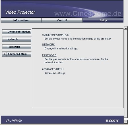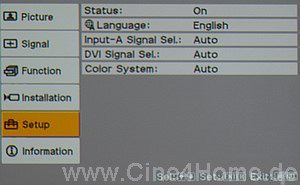Die letzte Rubrik, das "Setup"-Menü, ist für fortgeschrittene Nutzer gedacht. Hier können persönliche Informationen zum Besitzer, Memos, Standort des Projektors etc. abgespeichert werden. Auch das gesamte Netzwerk kann hier eingerichtet werden. Der Setup-Bereich wird bei Bedarf Passwort-geschützt, um unbefugten Zugang zu unterbinden.
