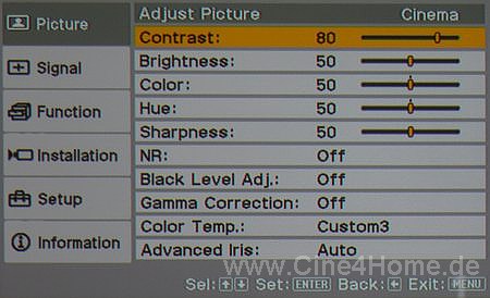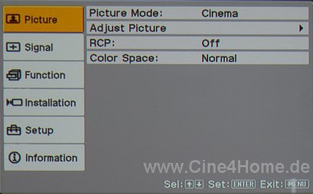 - Dynamisch sorgt für einen sehr angehobenen Kontrast, gedacht für helle Räume. - Cinema, ein spezieller Filmmodus für optimierte dunkle Räume. Zusätzlich stehen dem Anwender gleich drei Speicherbänke "User1-3" zur Verfügung, in denen er seine eigenen "Optimalwerte" jederzeit abrufen kann.