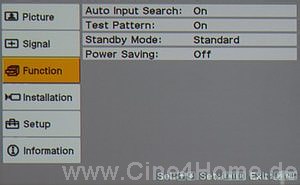 - "Function"-Menü Im Menü "Funktion" bieten sich diverse Projektor-spezifische Bedienkonfigurationen. "Auto Input Search" bewirkt, dass der Projektor nur auf Eingänge umschaltet, an denen auch ein Signal anliegt. Dies ist eine sinnvolle Funktion, doch wäre sie bei einer besseren Fernbedienung mit direkten Quell-Tasten überflüssig. Mit "Test-Pattern" wird ein praktisches Testbild bei der Zoom & Schärfejustage der Optik automatisch eingeblendet. "Standby Mode" und "Power Saving" sind umweltschonende Funktionen zum Stromsparen ;-) .