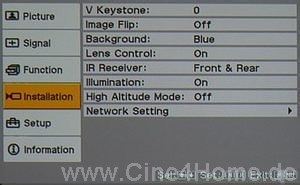 - " Installation"-Menü Gemäß dem Namen befinden sich in dem Installationsmenü alle Aufstellungs-relevanten Parameter: Neben Trapez und Projektionsart lassen sich hier die Netzwerk Optionen einrichten, das beleuchtetet Sony-Logo auf der Projektorenoberseite abschalten oder die Optik auf ihre aktuelle Position fixieren, so dass sie nicht mehr aus Versehen mit der Fernbedienung verstellt werden kann.