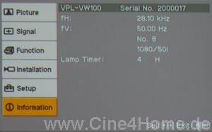 "Last but not least" verbleibt die Statusanzeige "Information": Sie ermöglicht das schnelle Überprüfen, welches Bildsignal gerade in den Projektor eingespeist wird und wie viele Stunden die Lampe bereits genutzt wurde.