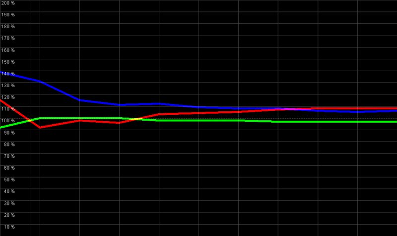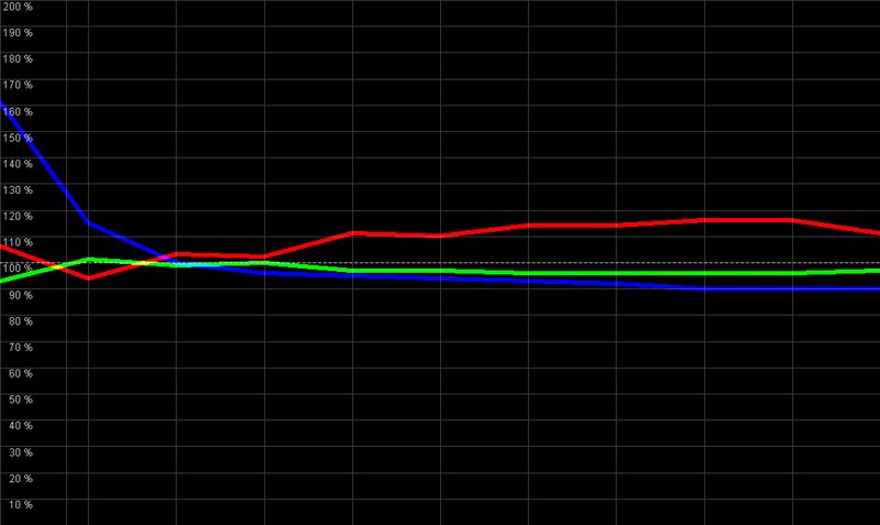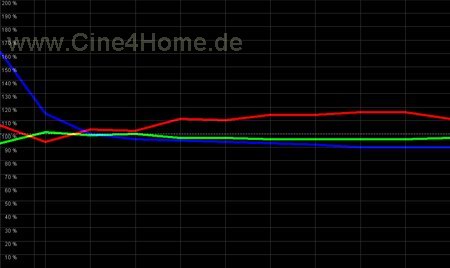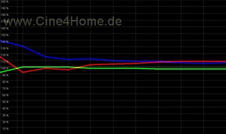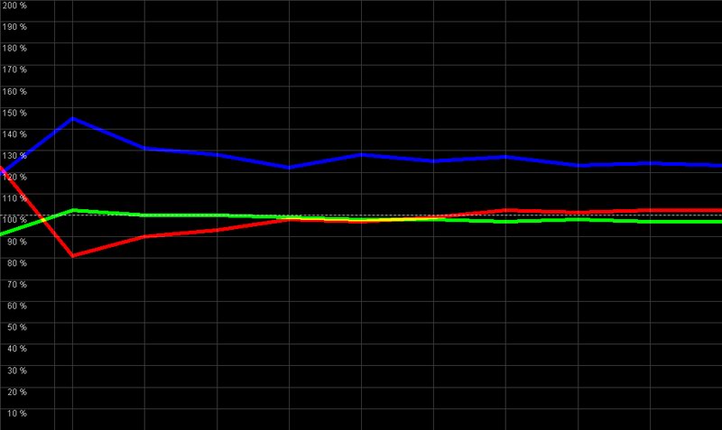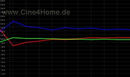 Das Diagramm oben zeigt, dass die Bezeichnung "niedrige" Farbtemperatur treffend ist: Mit rund 20% zuviel Rot fällt die Bilddarstellung deutlich zu warm aus, dadurch wirkt das Bild in vielen Bereichen zu rötlich. Besser erscheint das Ergebnis bei der "Mittel"-Stellung: Zwar wird auch hier die optimale Farbtemperatur nicht erreicht, doch ist die Abweichung nicht so groß. Die Farben sind in allen Helligkeiten gleich verteilt, lediglich ein gewisser Grünmangel macht sich bemerkbar.
