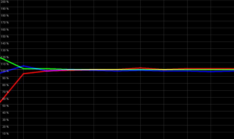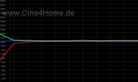 Im Diagramm oben erkennt man, dass ein Gammaanstieg von 2.4 mit Hilfe der Software problemlos erreicht werden kann. Die Kombination aus sehr guter Werkseinstellung auf die Videonormen und die Möglichkeit der nachträglichen Korrektur per PC Software bringt dem Projektor in dieser Rubrik Spitzennoten.