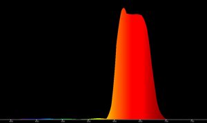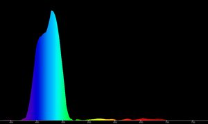 Obige Messungen zeigen deutlich, wie alle Wellenlängen einer jeden Farbe nahezu gleich stark vertreten sind: Statt schmalen Peaks zeigen sich hier breite Glockenformen. Im direkten Vergleich zu einem UHP Spektrum wird der Unterschied deutlich: