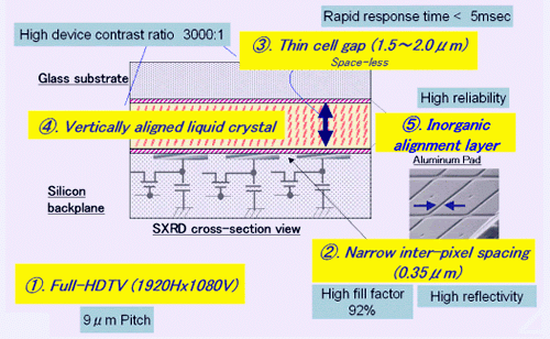 Das obige Schema zeigt den Querschnitt eines Qualia-SXRD-Panels: Hinter einer dünnen Glasschicht befinden sich rund zwei Millionen Pixel (1), zwischen ihnen ist nur ein Abstand von jeweils 0.35µm (2). In den Zellen, die nur 1.5 bis 2.0µm breit sind (3), befinden sich die vertikal ausgerichteten Flüssigkeitskristalle (4), dort erfolgt die eigentliche Polarisierung des Lichtes. Oft diskutiert wird die Langlebigkeit von den Panels. Entscheidend ist bei SXRD die anorganische Alignment Layer (5), die keine Alterungserscheinungen erwarten lässt. In der hinteren Silikon-Schicht befinden sich schließlich die verspiegelten Elektroden. Neben hohem Kontrast und kurzer Reaktionszeit ist die geringe Pixelstruktur in jeder Hinsicht vorbildlich, die von der Full-HD Auflösung noch zusätzlich profitiert.