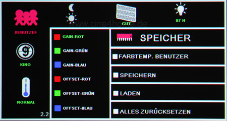 Allerdings zeigt sich recht schnell, dass unheimlich viele Funktionen vorhanden sind, es gibt gleichsam keine Grenzen im Bereich Bildoptimierung. Manche Optionen sind sogar doppelt vorhanden. Der Vorteil ist, dass man über verschiedene Wege eine Einstellung vornehmen kann. Allerdings entstehen stellenweise auch Widersprüche: So fragt man sich zum Beispiel, was die Einstellung der RGB-Farbtemperatur unter dem Menüpunkt „Speicher“ zu suchen hat.
