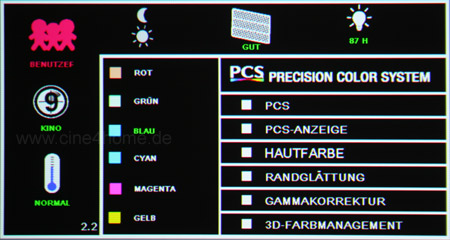 Neben zahlreichen erweiterten Bildoptionen bietet der Projektor das so genannte „ Precision Color System “ (PCS). Mit diesem ist ein optimiertes Bildmanagement in unglaublicher Detailverliebtheit möglich. Man hat die Möglichkeit, die PCS-Standardeinstellungen zu aktivieren, kann aber auch manuell das Bild optimieren. Möglich sind Hautfarbenkorrektur, Randglättung, Gammakorrekturen und ein erweitertes Farbmanagement.