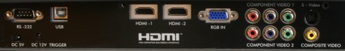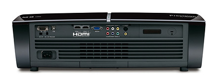 Auf der Rückseite des Viewsonic 8100 sieht man sofort eine Vielzahl an Anschlüssen. Neben zwei HDMI-Anschlüssen bietet der Projektor einen RS-232-Anschluss sowie einen RGB-Eingang zur Interaktion mit einem PC. Weiterhin gibt es zwei COMPONENT VIDEO-Anschlüsse, die als analoge Komponentenschnittstelle dienen und einen S-Video- und COMPOSITE VIDEO-Anschluss, zur Verbindung mit dem S-Video Ausgang eines herkömmlichen Videogeräts. Auch ein USB-, DC-5V-, und DC-12V-TRIGGER-Anschluss befinden sich auf der Rückseite des Projektors.