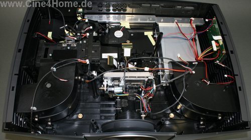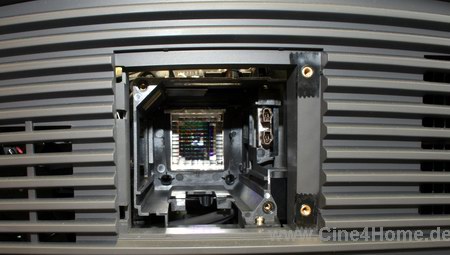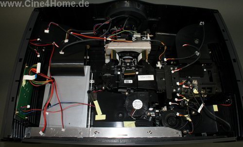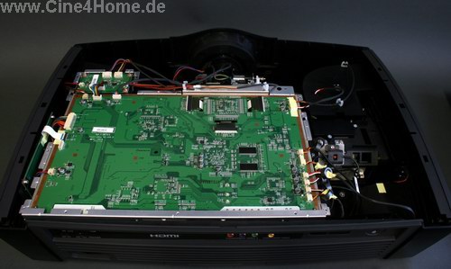 Unter der hübschen Schale des Pro 8100 befindet sich das Herzstück des Beamers: Die Technik. Nach dem Entfernen der Abdeckung blickt man zunächst auf die Signalelektronik, wie versprochen befindet sich mitten auf der Platine der HQV Scaler Chip aus dem Hause Silicon Optix. Durch hervorragende Leistungen hat sich das HQV Label zu einem Synonym für eine hochwertige Skalierung und Signalverarbeitung entwickelt.