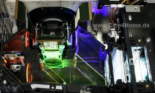 In der Mitte, also im Kern des Gehäuses, ist die LCD-Technik gut erkennbar. Das weiße Licht der Lampe besteht aus allen Spektralfarben, somit ist es möglich, auch einzelne Farben aus dem Strahl heraus zu filtern. Dies geschieht über halbdurchlässige Spiegel, die sich im Lichtweg befinden. Der erste von ihnen spaltet die blaue Farbe ab und projiziert sie auf einen Spiegel. Dieser lenkt sie dann auf das LCD.