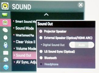Der LG PF1500 verfügt zwar über zwei interne Lautsprecher, doch naturgemäß verfügen diese nur über ein begrenzte Leistung und Klangqualität, für „wahres Kinofeeling“ sind sie zweifelsohne zu unterdimensioniert. Ein paralleles Kabelverlegen der Signalquelle zu externen Verstärkern würde die Flexibilität jedoch erheblich einschränken und den Vorteil der kabellosen Zuspielung umkehren. Doch auch hierfür haben die Ingenieure eine geniale Lösung gefunden: Auf Knopfdruck sendet der Projektor seinen Ton per Funk an jeden beliebigen Bluetooth tauglichen Verstärker, Lautsprecher, Soundbar oder Kopfhörer. So wird es möglich, den Ton komplett auf die heimische Surroundanlage „auszulagern“, ohne ein einziges Kabel zu verlegen.