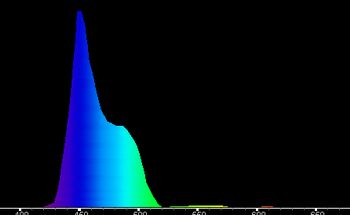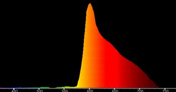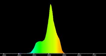 Im Rot fehlen vor allem die Lichtfrequenzen unter 550Nm. Das gesamte Spektrum, dass das Auge für Rot verwendet, ist nicht geboten. Dennoch ist das auf dem Bild erscheinende Rot angemessen kräftig. Das Grün zeigt nur minimale Defizite. Hier fehlen nur wenig Lichtteile über 600nm.