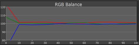 Auch die Farbmischung / der Weißabgleich auf die von der Videonorm verlangten 6500K / D65 in neutrale Graustufen sind ab Werk vorbildlich (Preset „Normal“) und erscheint nur minimal zu kühl.