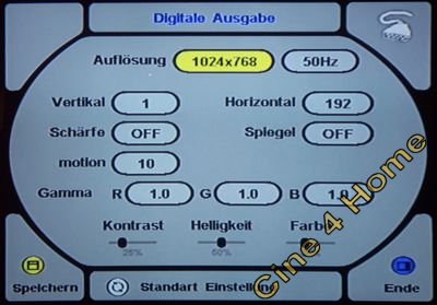 Einer optimalen Anpassung auf den Projektor steht damit nichts im Wege. Noch weiter gehen die Bildeinstellmöglichkeiten des DVI-Menus. Hier können zusätzlich zu Kontrast, Farbe und Helligkeit auch die Gammacharakteristika jeder Grundfarbe feinjustiert werden.