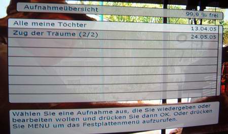 Eine weitere sehr nützliche und immer mehr Akzeptanz findende Funktion ist das zeitversetzte Fernsehen, hier zeichnet der Receiver das Programm auf, während er gleichzeitig schon mit der Wiedergabe desselben begonnen hat. Die Wiedergabeoptionen des Festplattenrekorders umfassen die gängigsten Funktionen. In einer tabellarischen Übersicht werden alle Aufnahmetitel der Festplatte abgebildet, mit Aufnahmedatum.