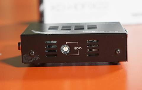 Der Anschluss der kleinen Box ist weitgehend selbsterklärend: Ein HDMI Eingang, ein HDMI Ausgang und zwei Einstellregler: