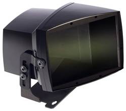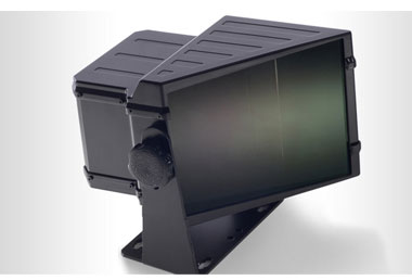 b) Der nächste Schritt besteht darin, die Neigung der Linse genau auf den Projektions-Winkel des Projektors abzustimmen. Auch dies lässt sich dank der präzisen Gelenke gut bewerkstelligen. Auch wenn die Gläser des Anamorphoten komplett vergütet sind und eine höchstmögliche Lichtdurchlässigkeit gewährleisten, so entstehen evtl. bei senkrechter Durchleuchtung minimale Reflektionen, die zurück in den Lichtweg gelangen und dort evtl. Schatten provozieren können. Aus diesem Grunde sollte man Lensshift und Optik so einstellen, dass ein gewisser Winkel zwischen Projektor und Anamorphoten entsteht. Durch diesen Trick fallen evtl. Reflektionen nicht zurück ins Bild, sondern werden nach unten abgelenkt.
