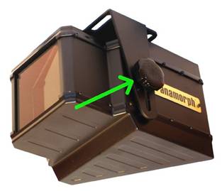 Die Justage Prozedur im Einzelnen: a) Als erstes gilt es, die Optik so vor dem Objektiv des Projektors zu positionieren, dass der Lichtstrahl genau durch das Eingangsfenster des Anamorphoten passt. Je dichter sich der Anamorphot vor dem Objektiv befindet, desto mehr Spielraum steht zur Verfügung. In der Regel ist dies daher ein möglichst minimaler Abstand direkt vor der Projektionsoptik optimal. Die vertiefte Optik des VW1000 hat in diesem speziellen Fall die Aufstellung erschwert, weil bei Nichtgebrauch sich der Staubschutz des Projektors automatisch schließt und nicht den Anamorphoten berühren darf.