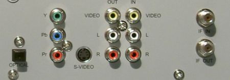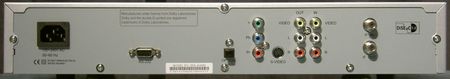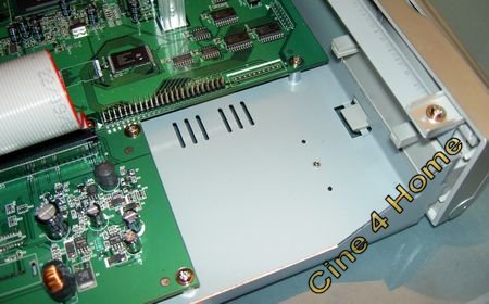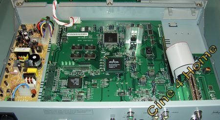 Die Rückansicht gibt einen Überblick über die Bild & Tonanschlüsse des Zinwell ZDX-410HD: Der wohl wichtigste Anschluss ist der YUV-Ausgang (3x Cinch). Nur über ihn können die HDTV-Signale in voller Auflösung übertragen werden. Leider existiert er nur in einfacher Ausführung. Daneben befinden sich ein S-Video- sowie zwei Composite (Cinch)- Ausgänge. Eine in Europa sonst übliche Scart-Buchse sucht man vergebens. Aus qualitativer Sicht ist dies verschmerzbar, doch ein Anschluss an einem herkömmlichen Fernseher wird ohne Scart-Verbindung doch unter Umständen deutlich erschwert. Der empfangene Ton verlässt das Gerät wahlweise analog über zwei Cinch-Buchsen oder digital per Tos-Link. Das Hauptmanko der Ausstattung besteht in dem fehlenden Karten-Slot. Pay-TV Kanäle wie z.B. Premiere bleiben dem Benutzer bei dem Zinwell ZDX-410HD verwehrt. Schade, wird doch schon in wenigen Wochen ein Pay-Kanal von Euro 1080 gestartet, der ebenfalls eine Schlüssel-Karte erforderlich macht. Sieht man sich das Innere des Receivers aber genauer an, so besteht Anlass zur Hoffnung: Am Rand der Hauptplatine befindet sich ein Anschluss mit Platz daneben für eine Zusatzplatine, zufälligerweise genau hinter dem Teil der Frontblende, die eigentlich einen Karteneinschub vorsieht: